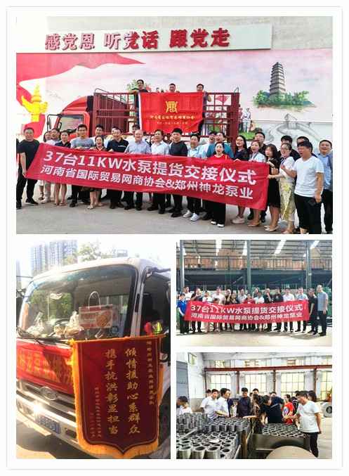 河南国际贸易网商协会、哈尔滨逸轩大型活动执行有限公司水泵提货交接,未来路街道赠神龙排涝突击队锦旗